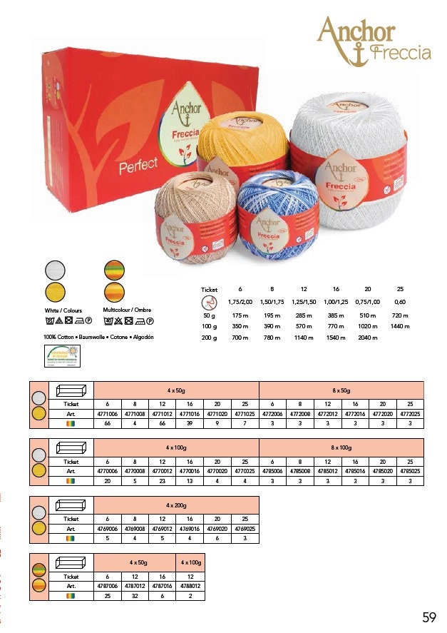ANCHOR FRECCIA Häkelgarn 50g/285m Häkeln Spitze Lace Baumwolle mercerisiert 3ply