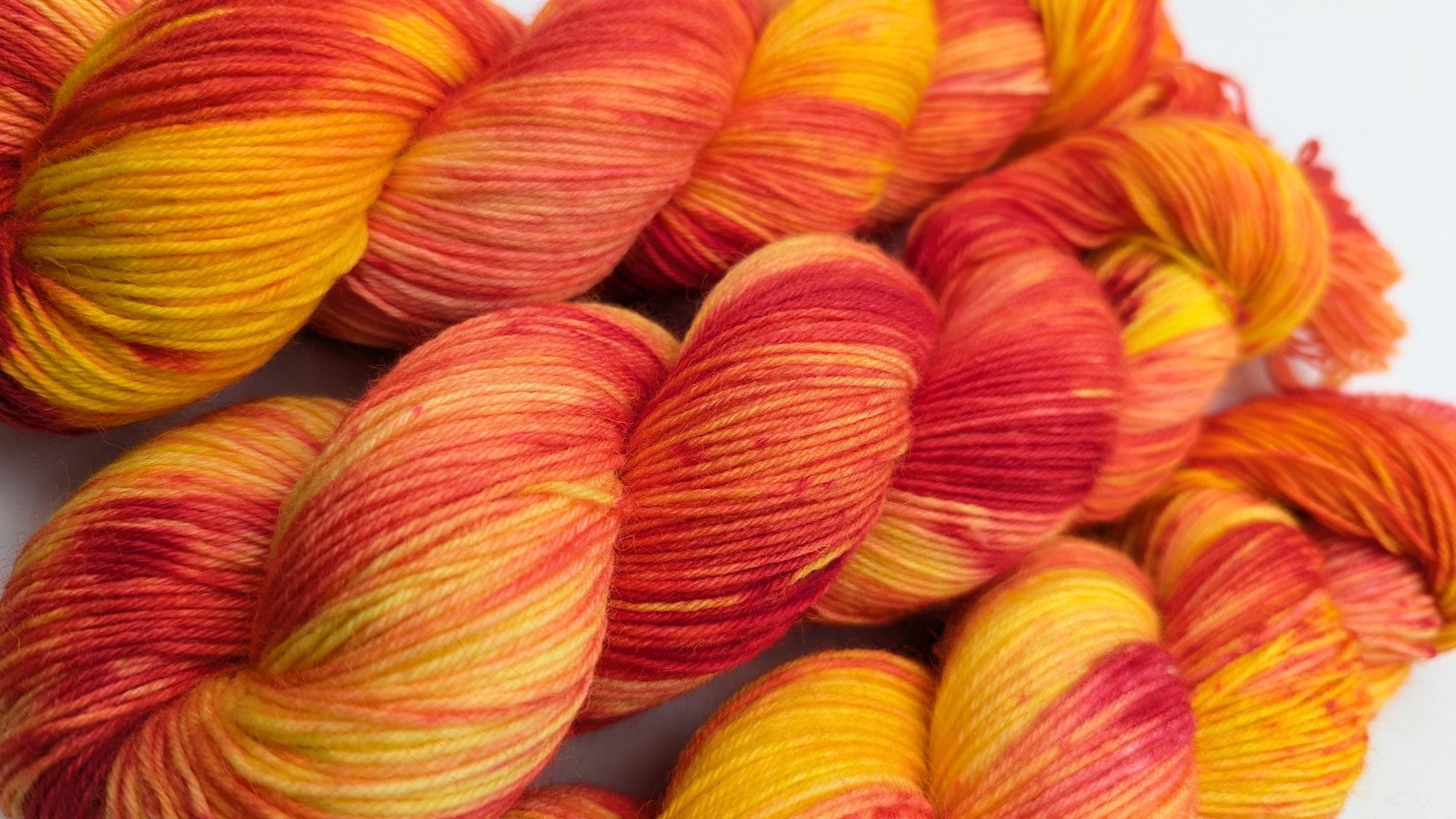 Handgefärbte Sockenwolle 4- fach 100g/420m "Sunny Afternoon" gelb rot mulesingfrei handdyed
